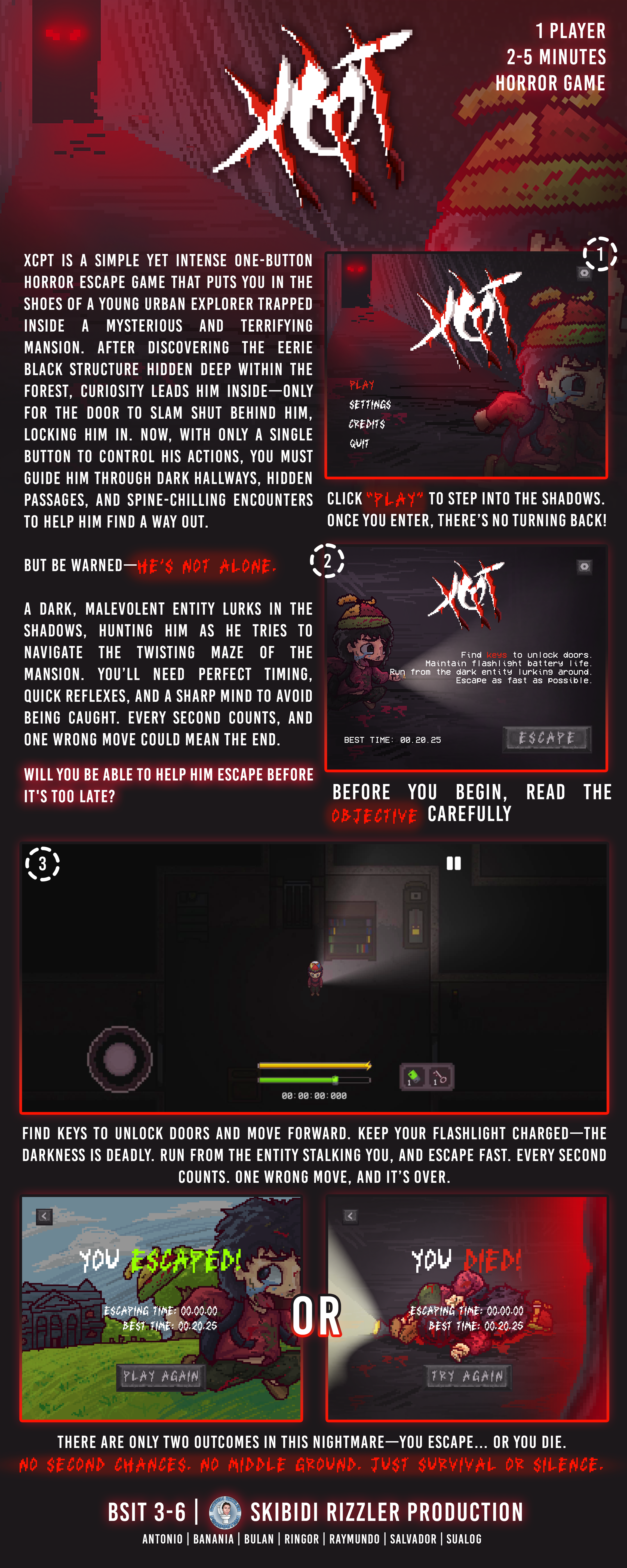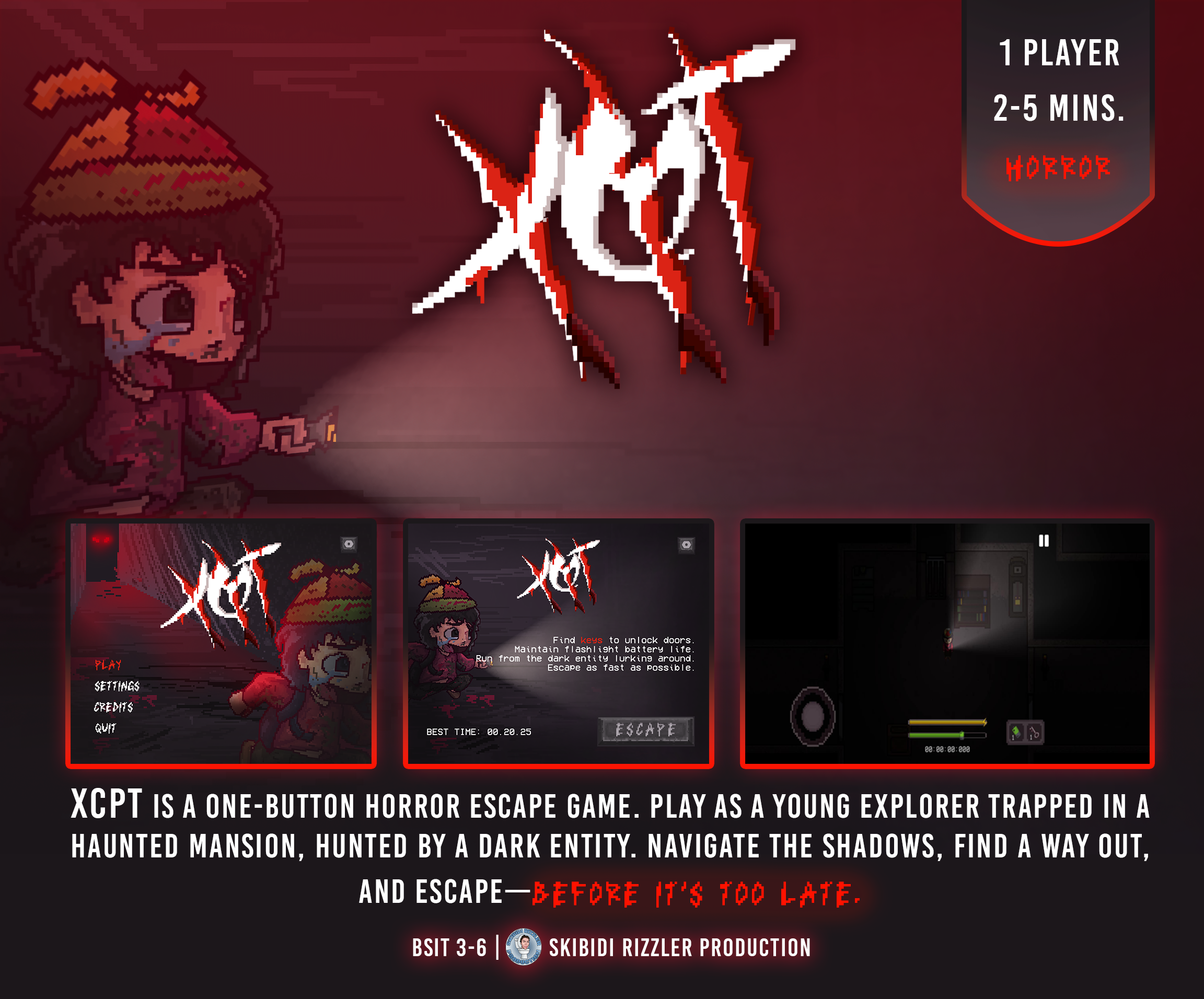 XCPT is a simple yet intense one-button horror escape game that puts you in the shoes of a young urban explorer trapped inside a mysterious and terrifying mansion. After discovering the eerie black structure hidden deep within the forest, curiosity leads him inside, only for the door to slam shut behind him, locking him in. Now, with only a single button to control his actions, you must guide him through dark hallways, hidden passages, and spine-chilling encounters to help him find a way out.